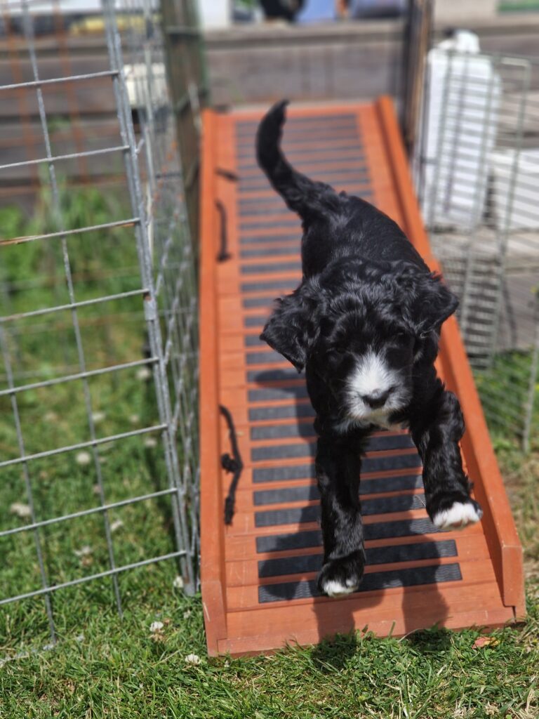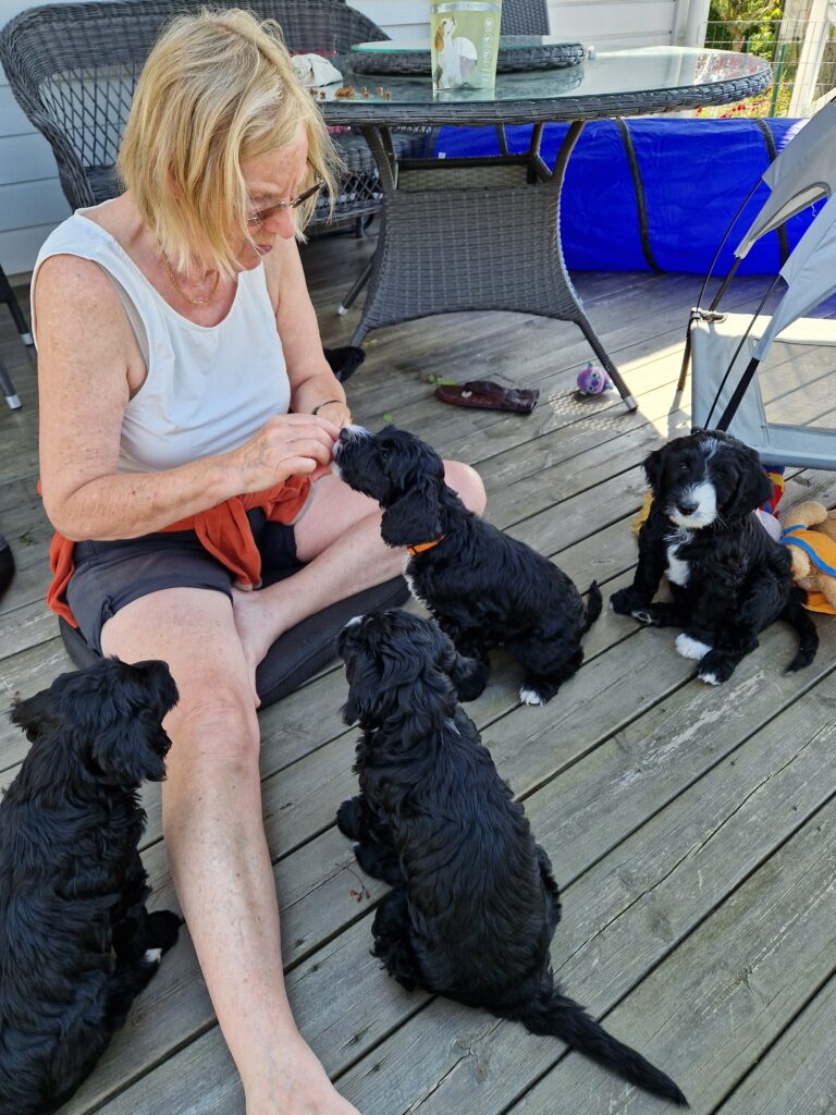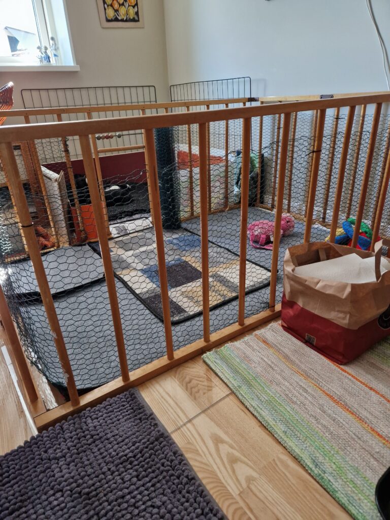 ”För några dagar sedan utökades valplådan med lek-/kisshage. Valparna är så duktiga. I natt hade det bara misslyckats en gång dvs att ngn inte orkade gå ut ur valplådan för att kissa. På söndag 22/6 är valparna 4 veckor och då kommer deras hage att flyttas in i vårt allrum och utökas.”